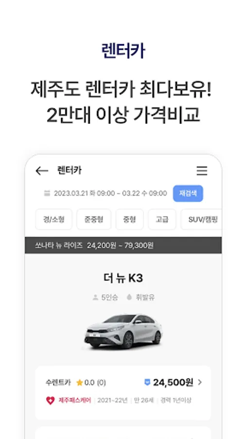 You can compare 90 companies and 20,000 vehicles. You can rent various car types at the lowest price, from Jeju Pass Rent-a-Car, which has the lowest price in Jeju Island and the largest number of companies, from compact cars to electric cars and imported/luxury cars.
