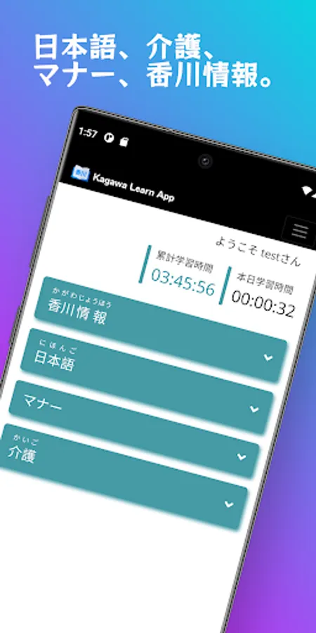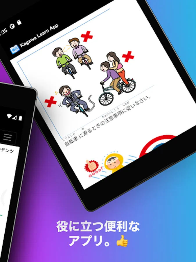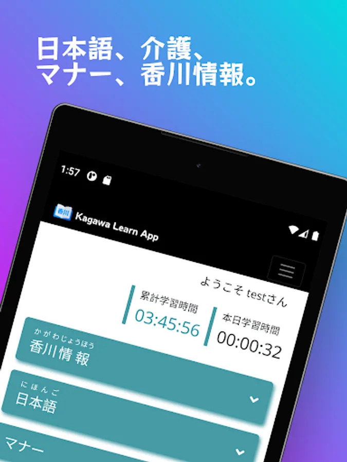 This app is not just for you to pass the proficiency test. A major feature is that you can learn about the business etiquette and customs you need to live in Japan. The only language learning app that will help you learn the rules necessary to live in Japan as a foreigner, learn about Kagawa Prefecture, and lead to a wonderful experience in Japan. That is the Kagawa learning app.