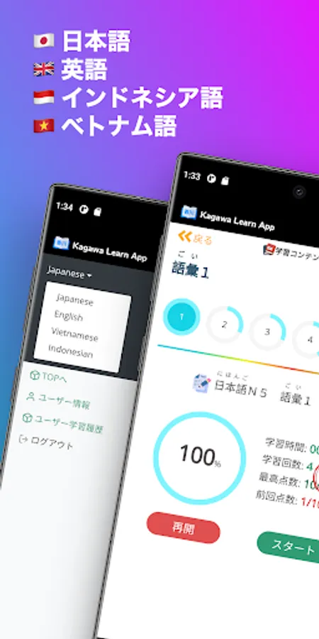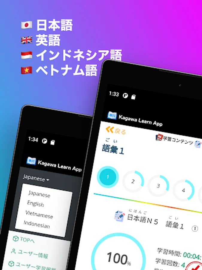 You can switch between English, Vietnamese, Indonesian, and Japanese, so you can study in your favorite language.