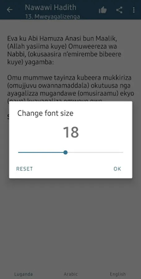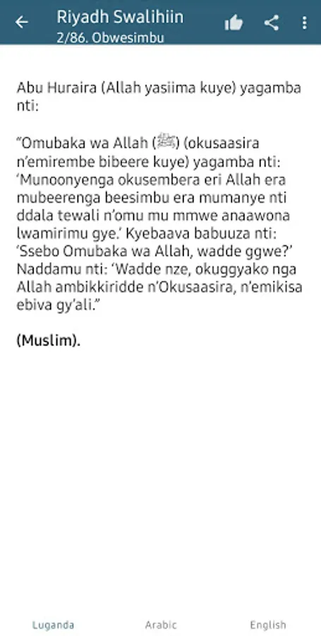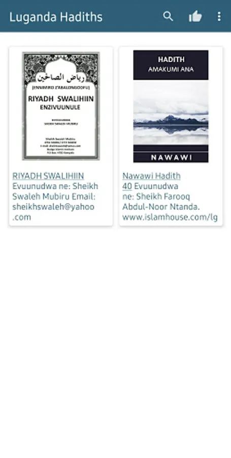 New updates of this App now includes over 1800 hadiths from Nawawi and Riyadh Swalihiin. Both translated in Luganda and english, along side the original arabic text.
