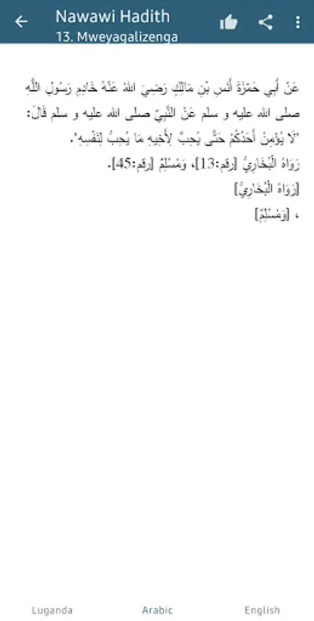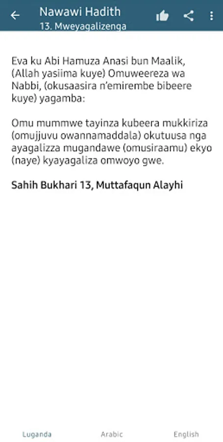 Luganda Hadith eyogenddwamu Hadith oluvannyuma lw'okusabibwa okuva eri abakozesa App eno. Kati erimu Nawawi Hadith amakumi Ana (40) ne Riyadh Swalihiin (Ennimiro z'abalongoofu). zivuunuddwa mu lulimi oluganda, nga mulimu oluwarabu, oluganda n'oluzungu byonna wamu.