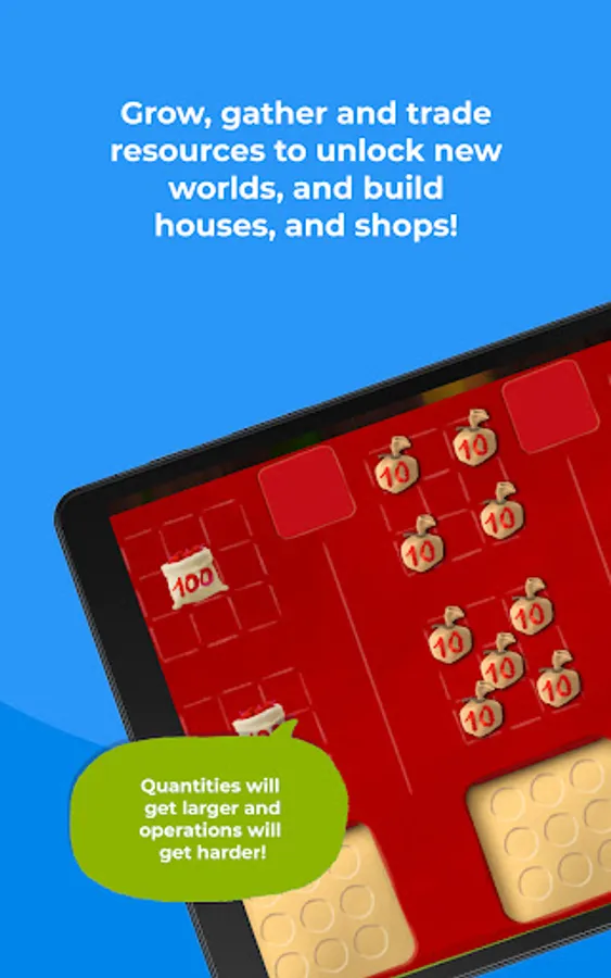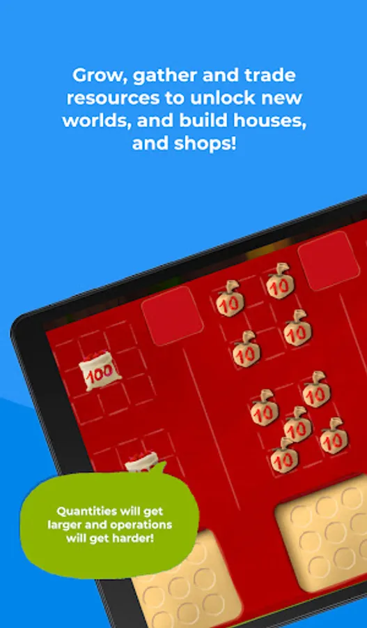 To advance in the game, your child must add and subtract to manage their resources. Over the course of the game, quantities will get larger and operations will get harder.