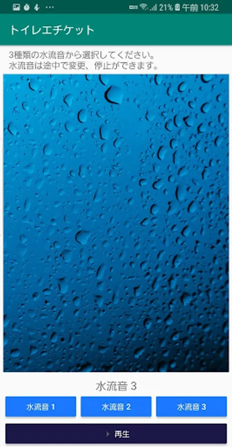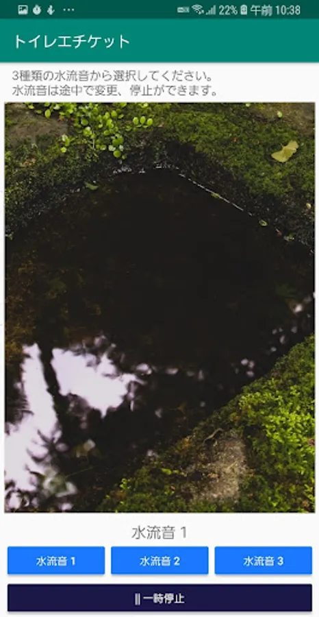 Sounds of concern when in toilet .... There is no problem with it if there is a sound princess, but there are many places that are not yet popular .... In such a case, if you have this application you can turn off the sound anywhere in the toilet! Since there are three water flow sounds recorded, it is also possible to use them according to your preference and the location of the toilet!