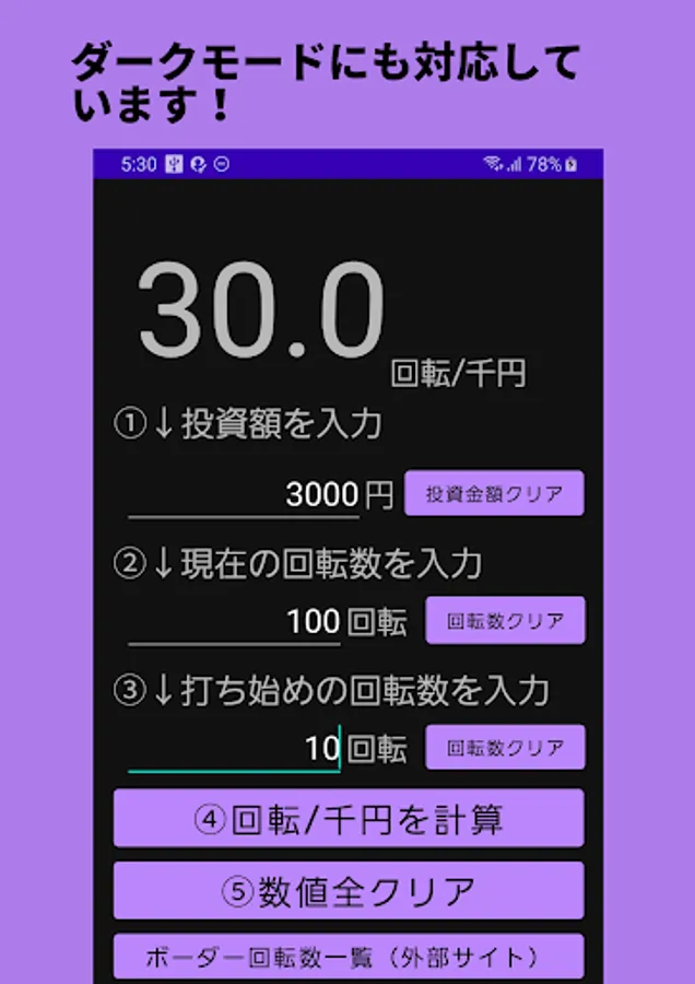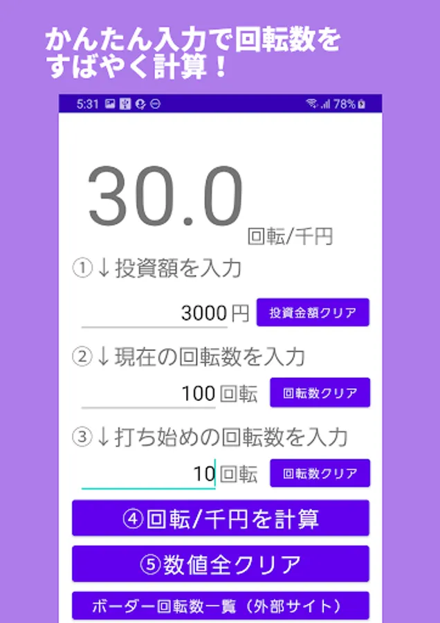 ・ Enter the investment amount and the number of rotations to calculate the rotation / thousand yen.