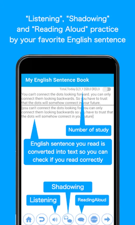 You can study English by listening, shadowing or reading aloud with English sentences you like.