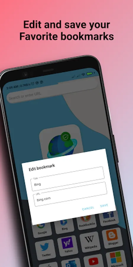 Long press on the bookmarks and add your favorite sites for quick access. Inbuilt bookmarks for most used sites around the world.