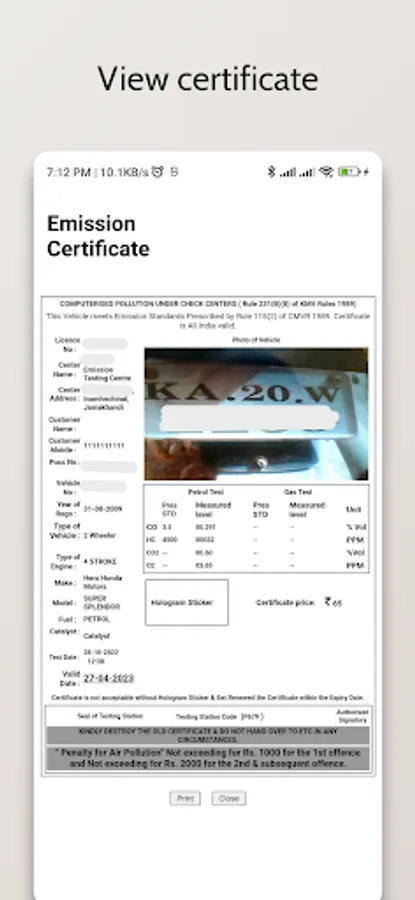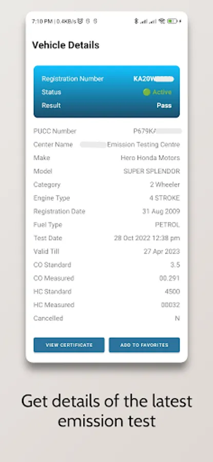 Use vehicle registration number to view the PUC check/emission test details and certificate. Applicable to Karnataka state only.