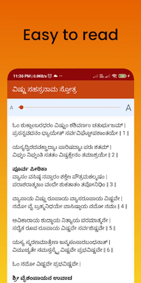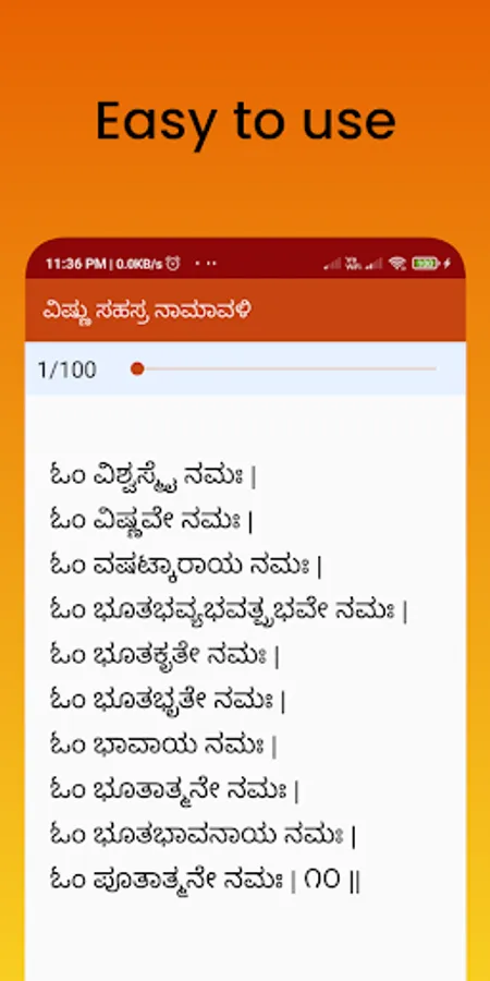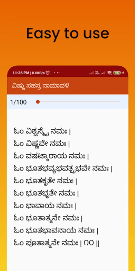 ಈ ಕನ್ನಡ ವಿಷ್ಣು ಸಹಸ್ರನಾಮ ಅಪ್ಲಿಕೇಶನ್, ನಾಮಾವಳಿ ಹಾಗೂ ಸ್ತೋತ್ರ ಎರಡನ್ನೂ ಒಳಗೊಂಡಿದೆ. ಇದು ಬಳಸಲು ಸುಲಭವಾಗಿದೆ ಹಾಗೂ ಓದಲು ಕೂಡ ಅನುಕೂಲಕರವಾಗಿದೆ.