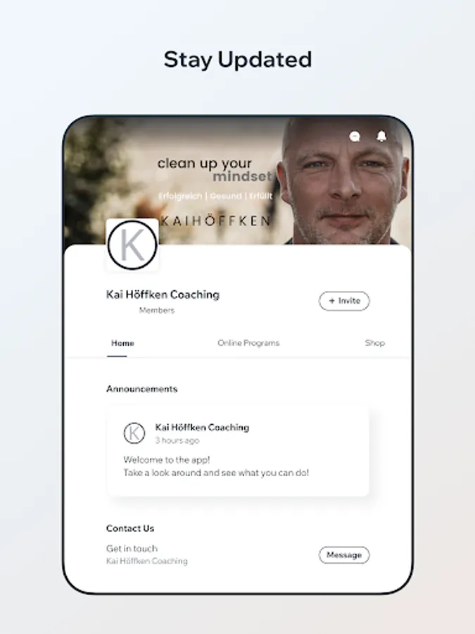 MyCoach KAI bietet Dir den Zugang zu Deinem Coaching. Über diese App kannst Du auf Deine CoachingProgramme, Deine CoachingGruppen zum Austausch und auf alle wichtigen Informationen zugreifen. MyCoach KAI bietet Dir so die Möglichkeit, Dein Coaching mit KAI HÖFFKEN auch mobil begleiten zu lassen und in den Austausch mit KAI und anderen Teilnehmern zu bleiben. Zudem erhält Du alle wichtigen Informationen zu interessanten Themen, Innovationen und kannst direkt auf den Blog zugreifen. Wir arbeiten kontinuierlich an den Funktionen und Erweiterungen der App.