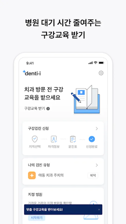 Apply for oral examination through Denti, search for examination targets, find designated hospitals, view oral examination results, and receive oral education.