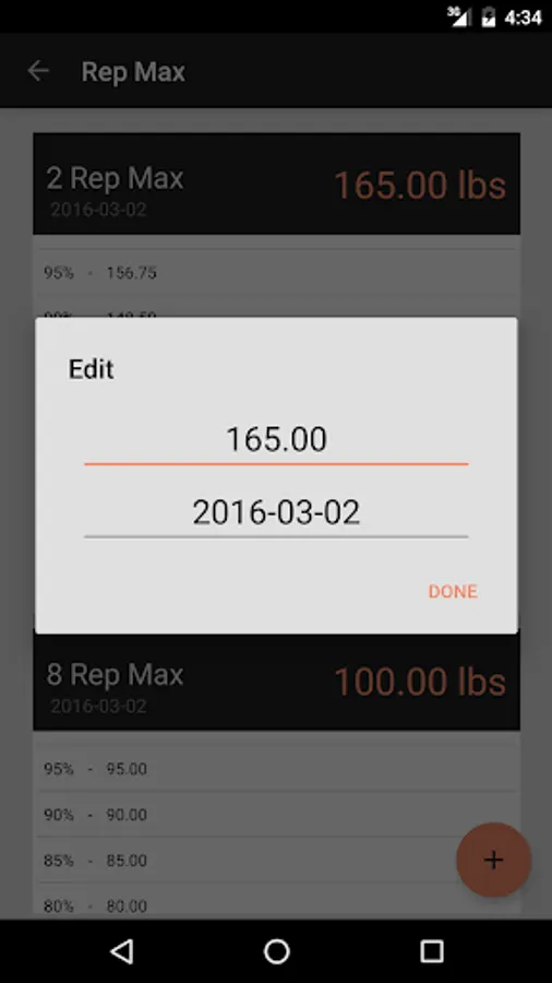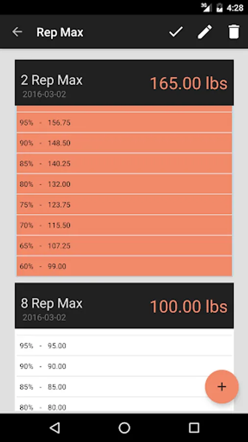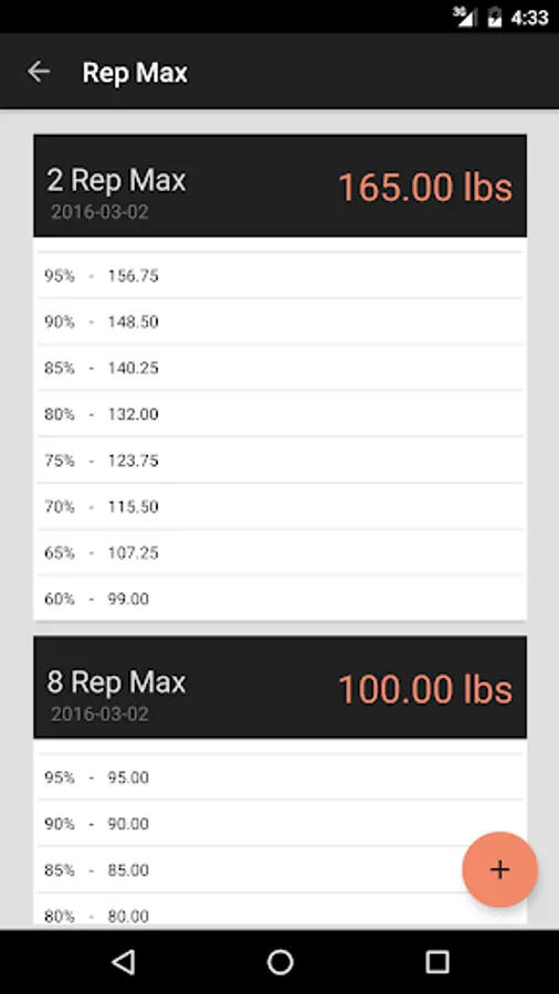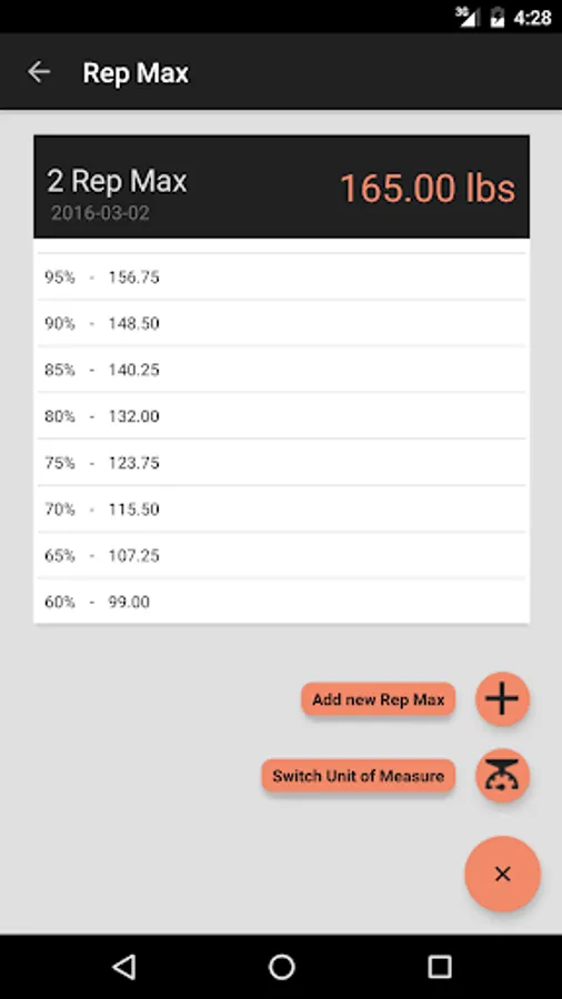 Keep track of your Rep Max. Rep Max Tracker is great for weight lifting, Olympic lifting and Crossfit. After you save your rep max, view the percentages so you don't have to calculate them.