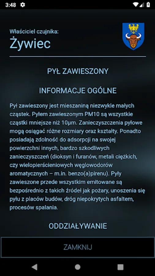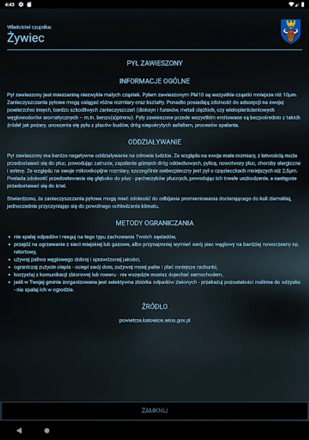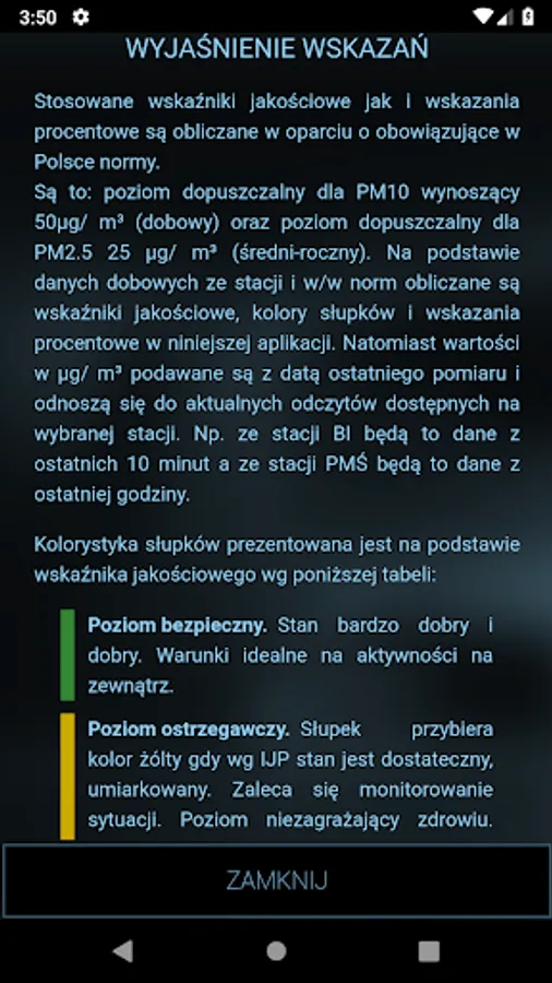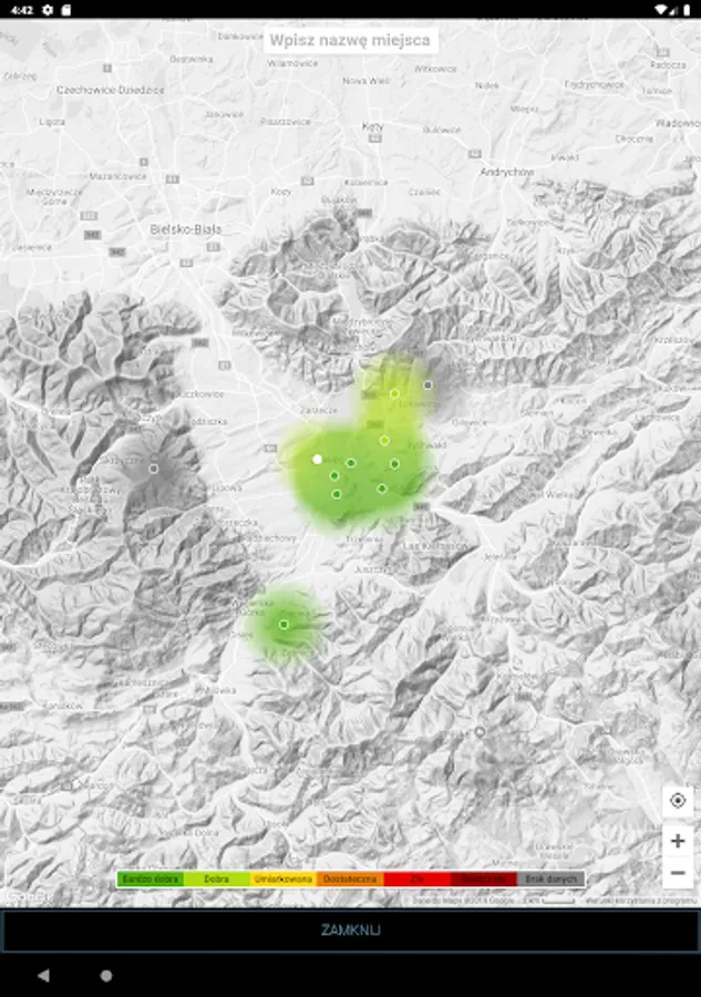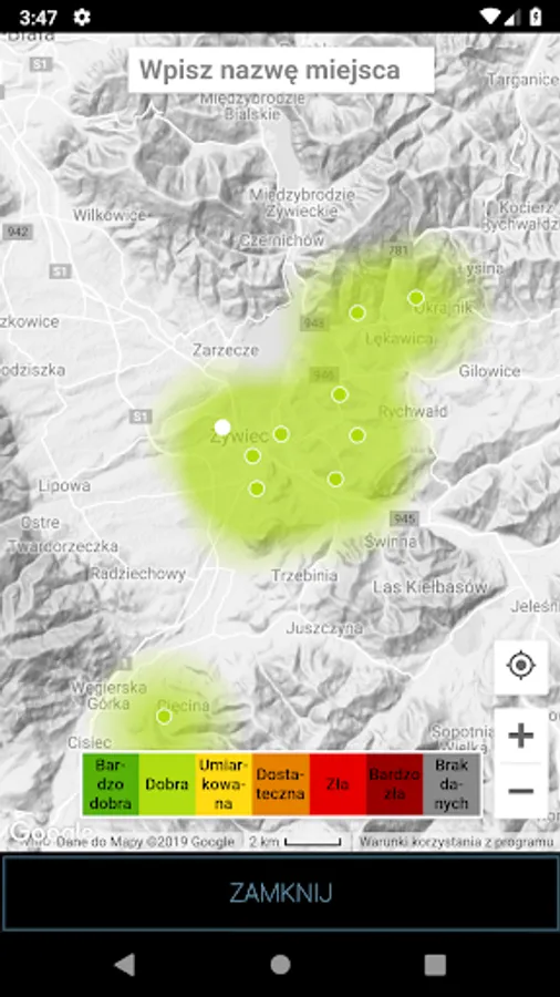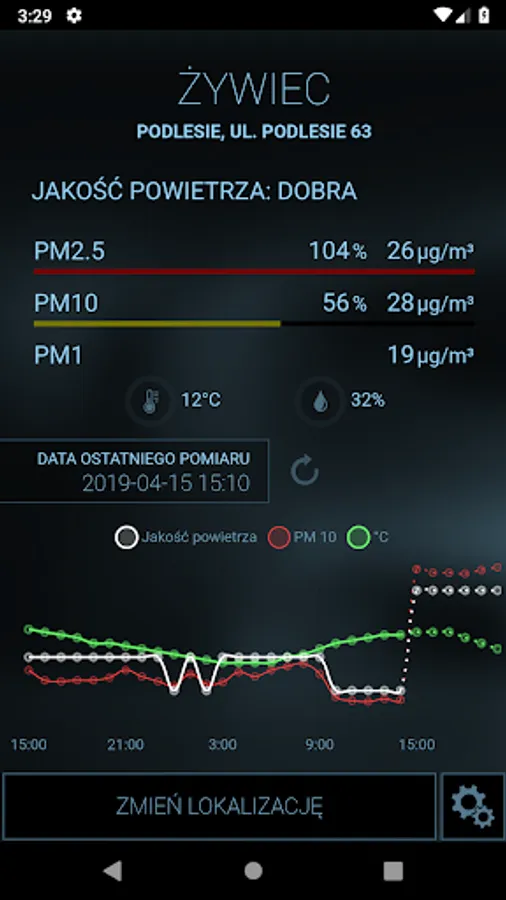 The application allows you to monitor the air quality in many places (Zywiec, Zory, Slaskie Party, Pyskowice Złotoryja Okrajnik, and also in the future and the next). Before you go out for a walk with a sick child or parent with asthma, check if what you find today outside the window and breathe in the lungs, not hurt you and your family.