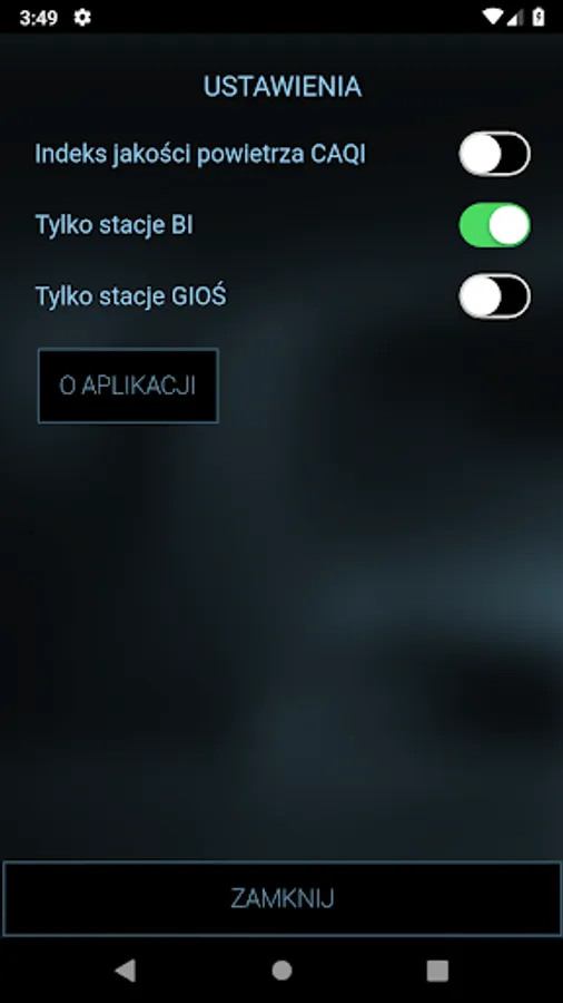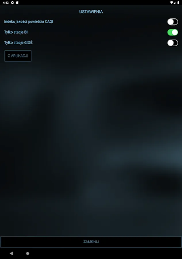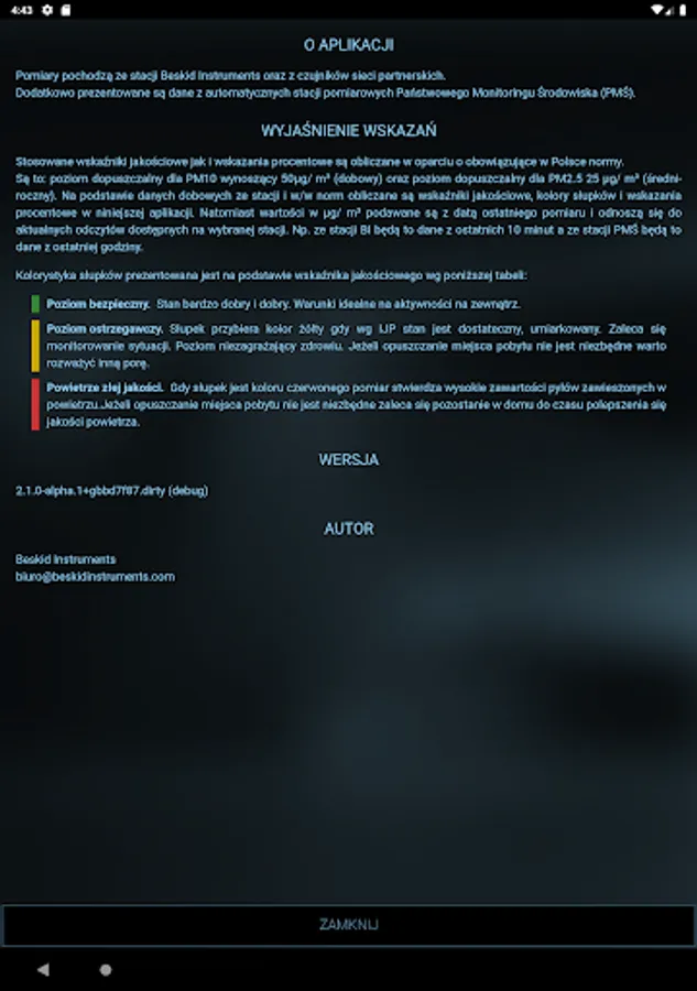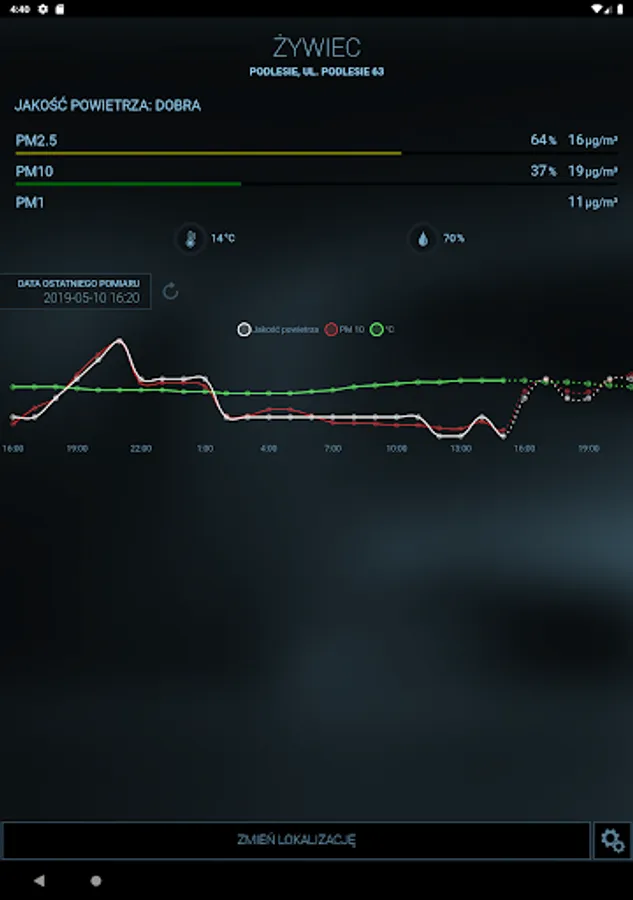 The basic function of the application is displaying a current state of the air for such substances as PM10, PM2.5, PM1.0, and humidity and temperature.