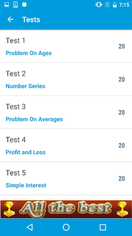 Practice Tests on Problems on Ages & Averages, Boats and Streams, Simple Interest, Number Series, Profit and Loss.