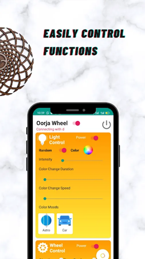 Oorja wheel has rotation, light and music features and all are controlled by your mobile phone via Bluetooth. It is only one of a kind in the world.