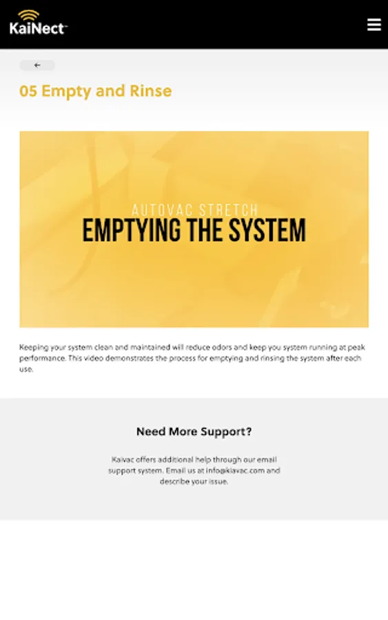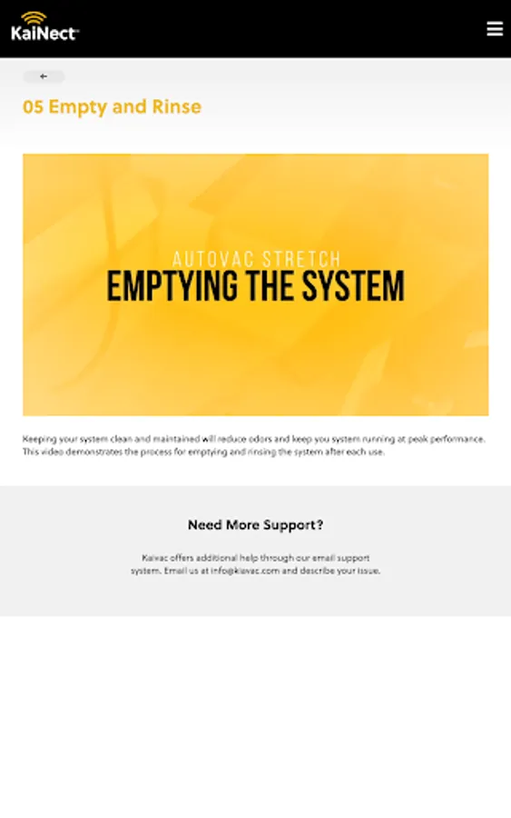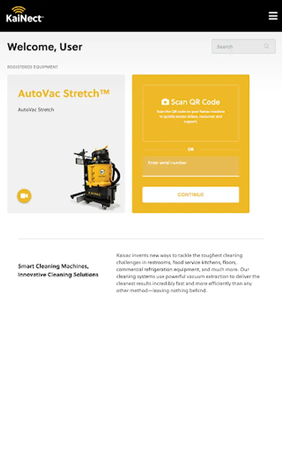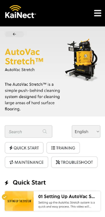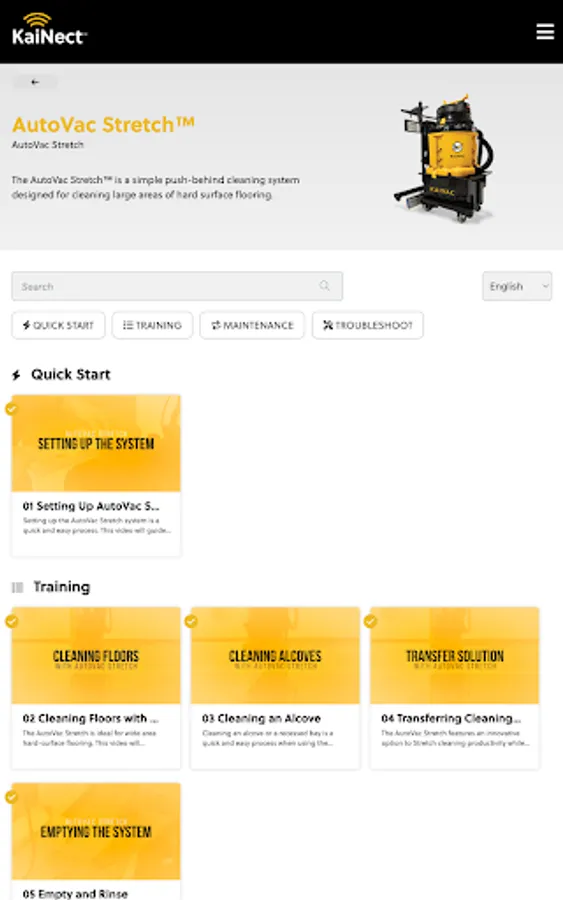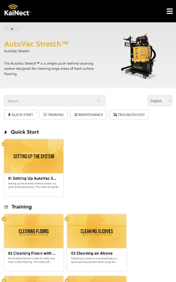 KaiNect™ by Kaivac provides training, maintenance instructions, and support for Kaivac cleaning equipment. Watch training and maintenance videos, register new equipment, and manage your fleet.