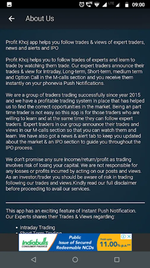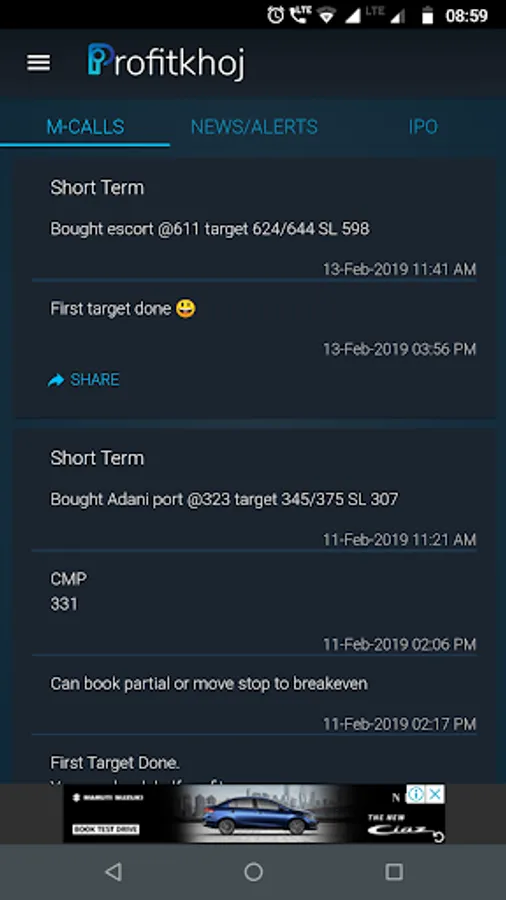 We are a group of traders trading successfully since year 2015 and we have a profitable trading system in place that has helped us to find the correct opportunities in the market. Being an part time trader is not easy so this app is for those traders who are willing to learn and at the same time they can follow expert traders. Expert traders in our group announce their trades and views in our M-calls section so that you can watch them and learn. We have also got a news & alert tab to keep you updated about the market & an IPO section to guide you throughout the IPO process.