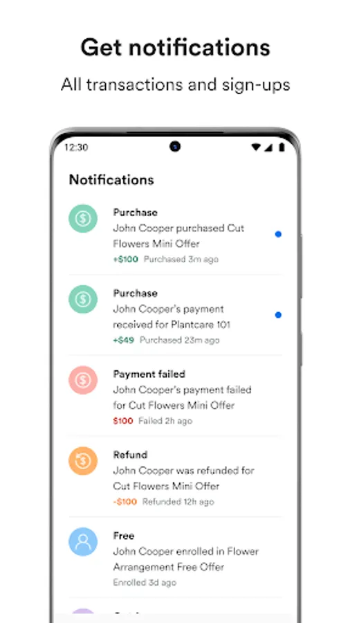 ■ Notifications. Receive instant notifications on all transactions, sales, subscriptions, email sign-ups, and registrations.