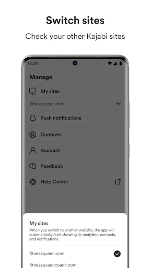 ■ Switch between Kajabi sites. Easily switch to another one of your Kajabi businesses to see its analytics, contacts, and notifications.