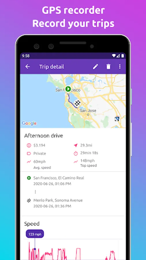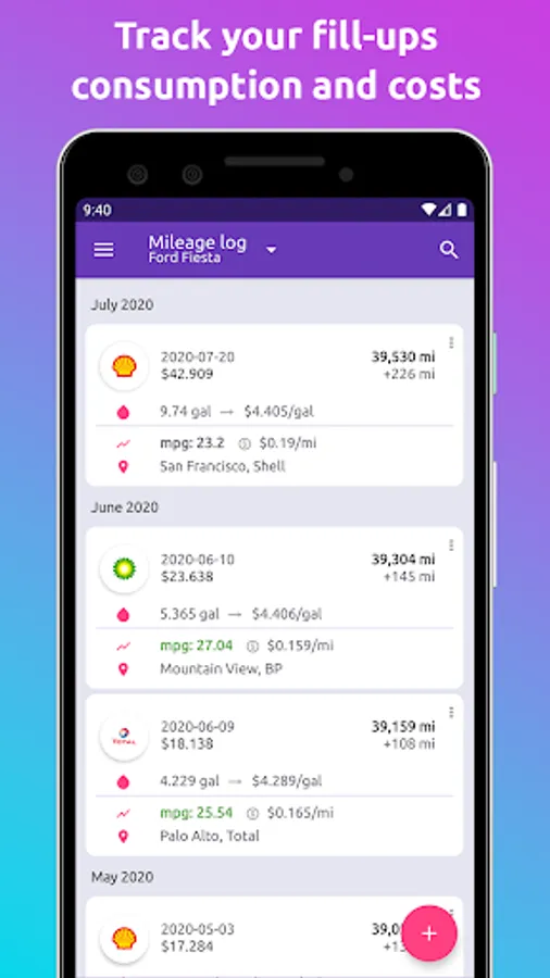 - Mileage log (track your fill-ups, gas costs, fuel economy, partial fill-ups, gps location)