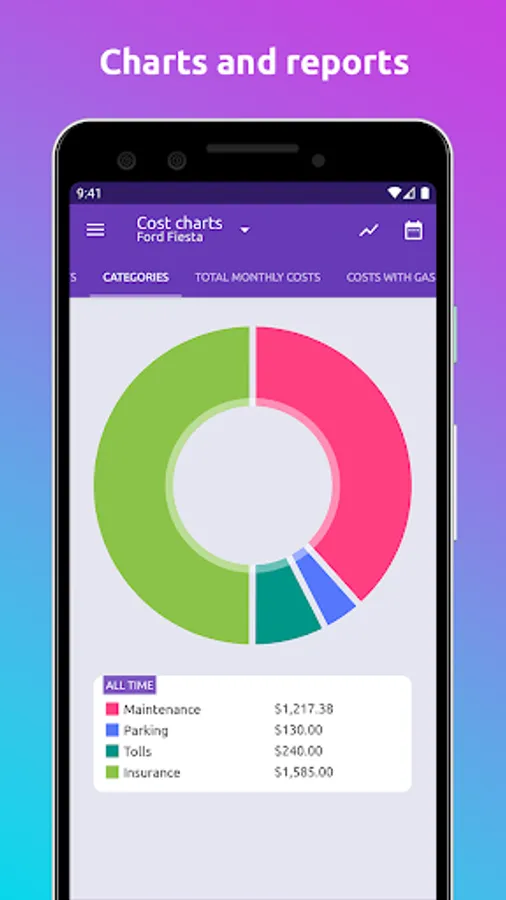 Cost charts (fuel vs other costs, categories, total monthly costs)