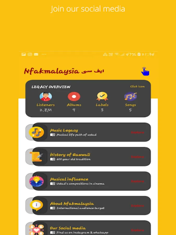 Nfakmalaysia is the first app in Malaysia to feature the legacy of Ustad Nusrat Fateh Ali Khan. This app will drive you through his contribution in the field of Sufi. To have a better understanding on Qawwali tradition, this app is a right platform for you to explore more about the depth of classical music. This application contains many reading equipments where it will provide the necessary source which are to be read and understood. Our newly designed user dashboard will definitely grab your interest to enhance your usage experience through our app. In terms of musical experience, our app features ustad's top 5 compositions where you can enjoy listening using our music player. Spreading his legacy through an application will definitely boost your exploring interest. Nfakmalaysia team would like to sincerely thank you for viewing and downloading our application. This is our humble tribute to the Qawwali legend, Ustad Nusrat Fateh Ali Khan.