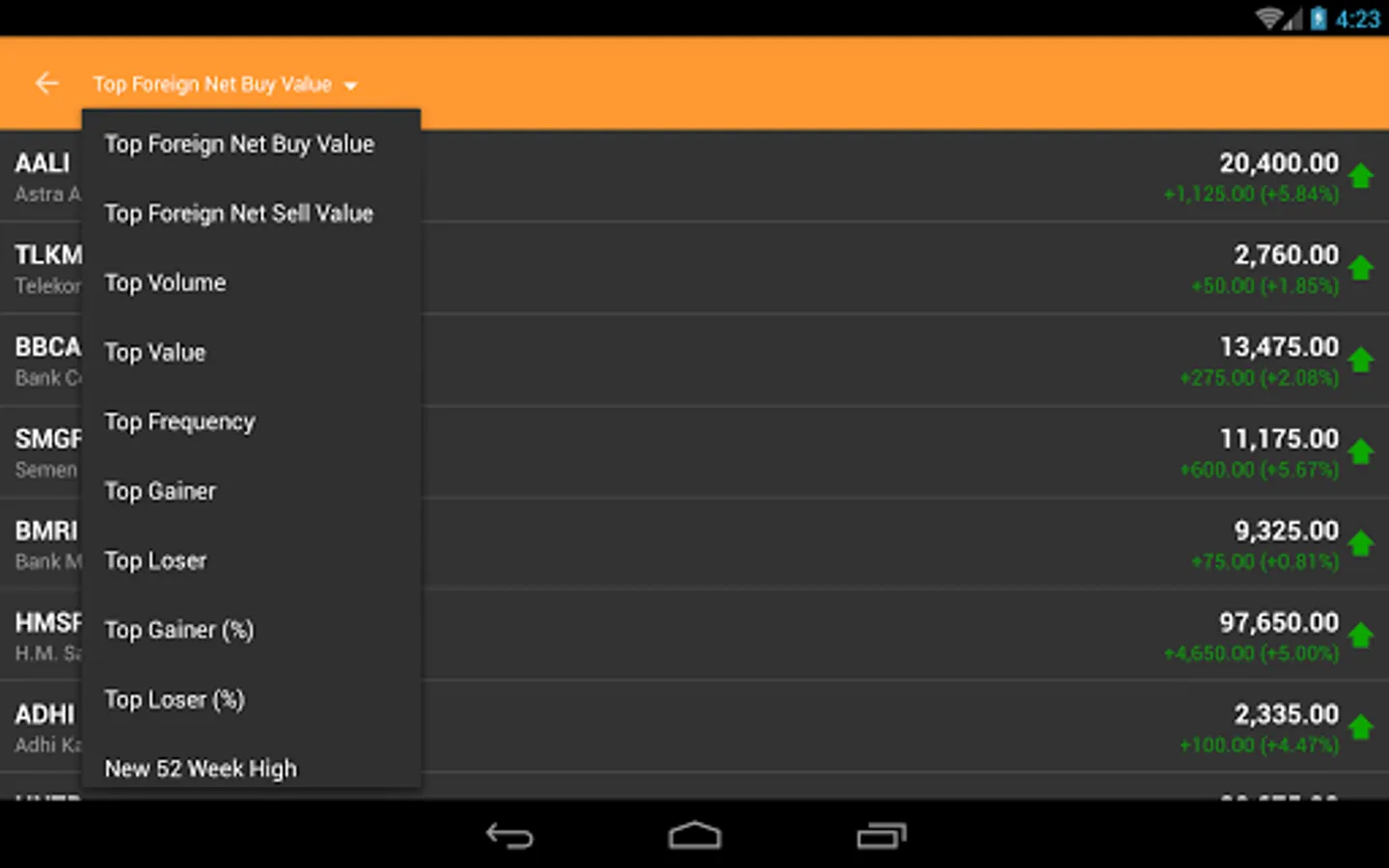 - Top position: top value, top volume, foreign net buy ranking, foreign net sell ranking, top gainer, top loser, top gainer (%), top loser (%)
