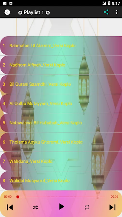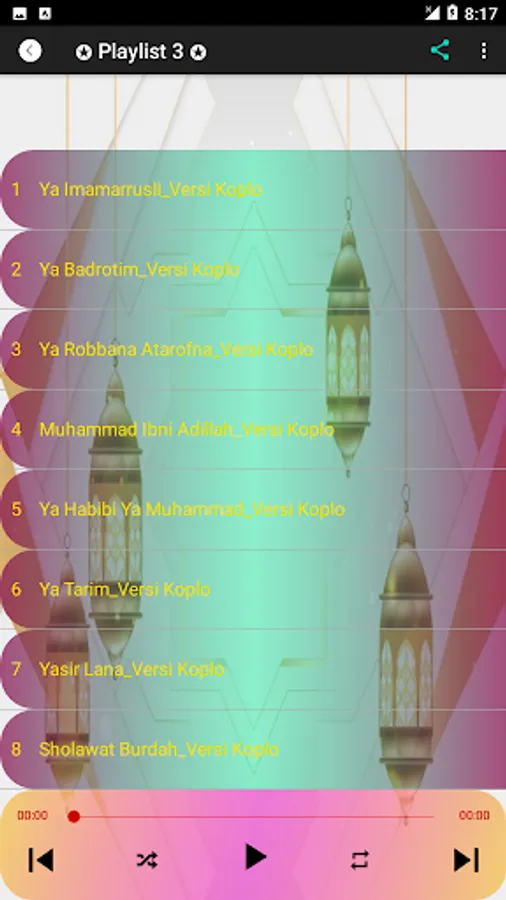 This application is an offline music player which contains prayer songs presented in the form of the Koplo genre. This application is presented with an attractive appearance and easy to use.
