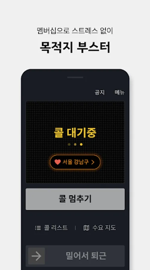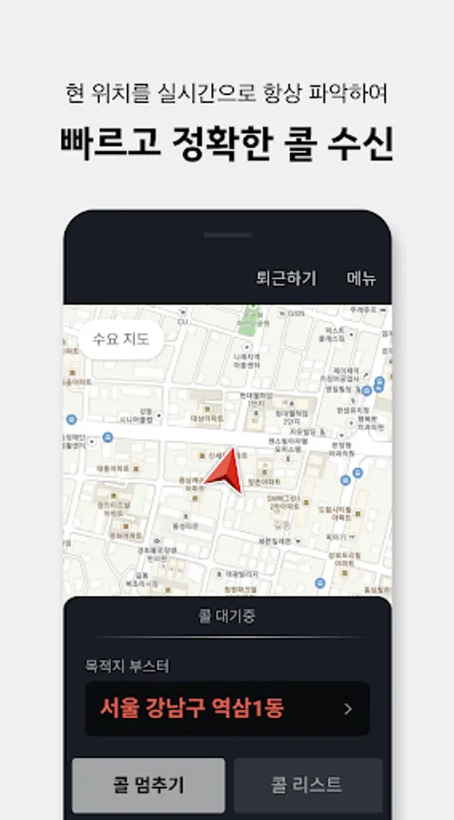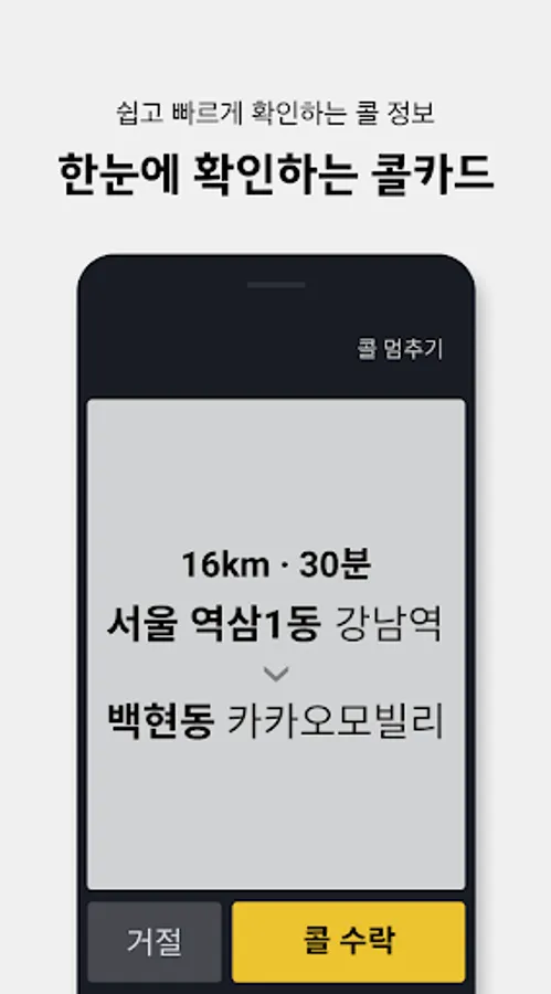 You can receive calls from passengers using Kakao T Taxi by entering ‘waiting for a call’ after entering the vehicle information in operation. Kakao T Taxi provides a preview of the passenger's location and destination when receiving a call.