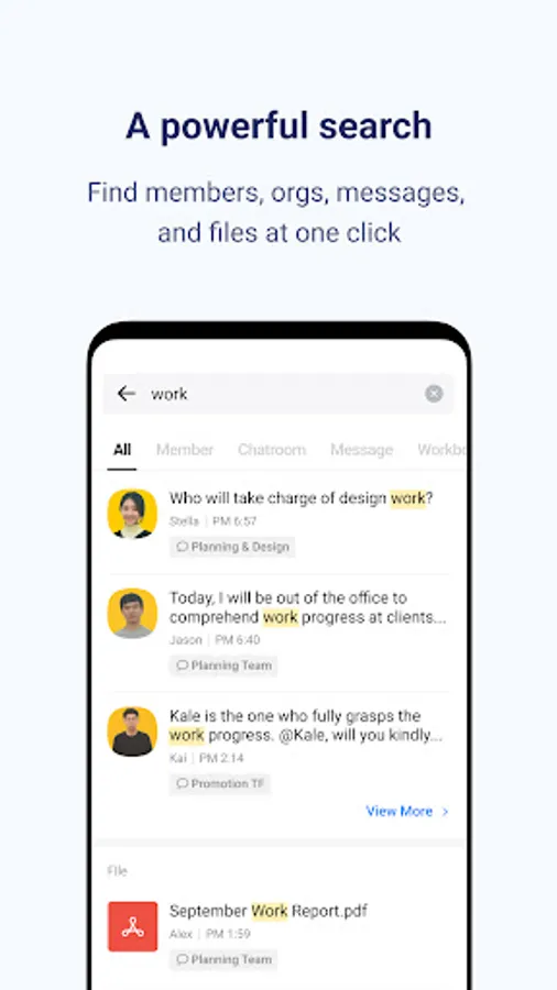 - Integrated Search helps you find members/organizations/messages/files at one click.