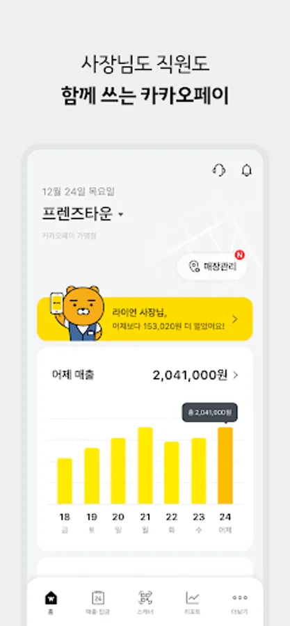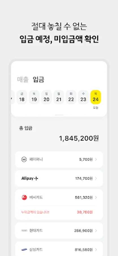 - Kakao Pay, card, cash, even delivery apps! You can see yesterday's sales, today's deposit schedule, and unpaid amount through the app every day.
