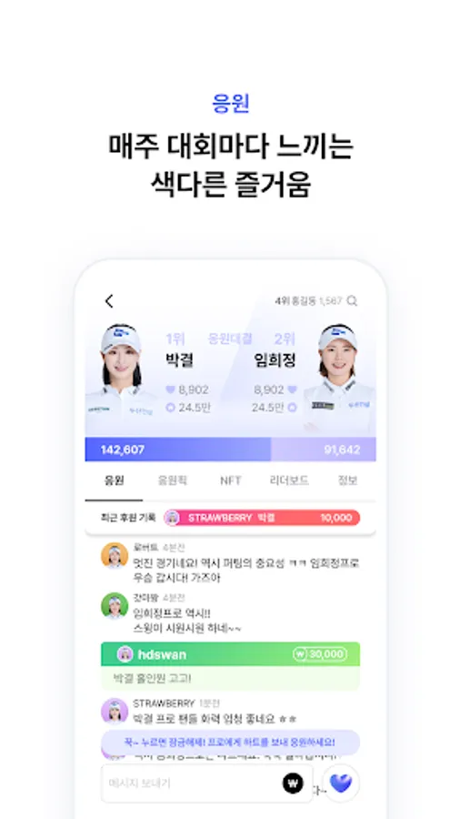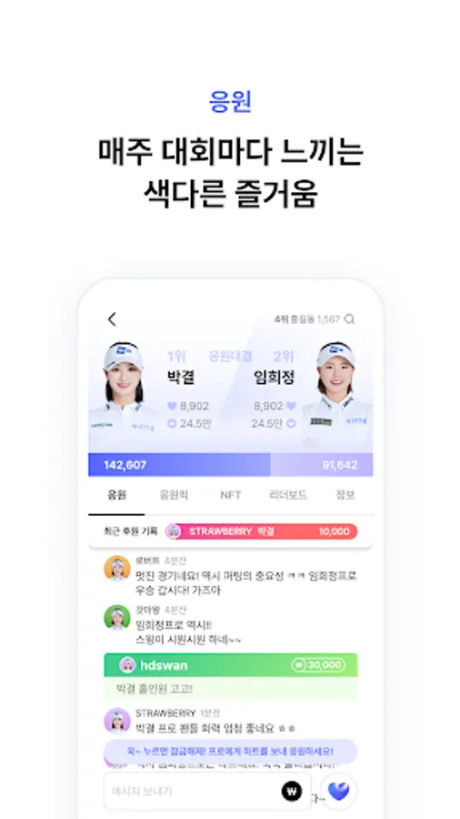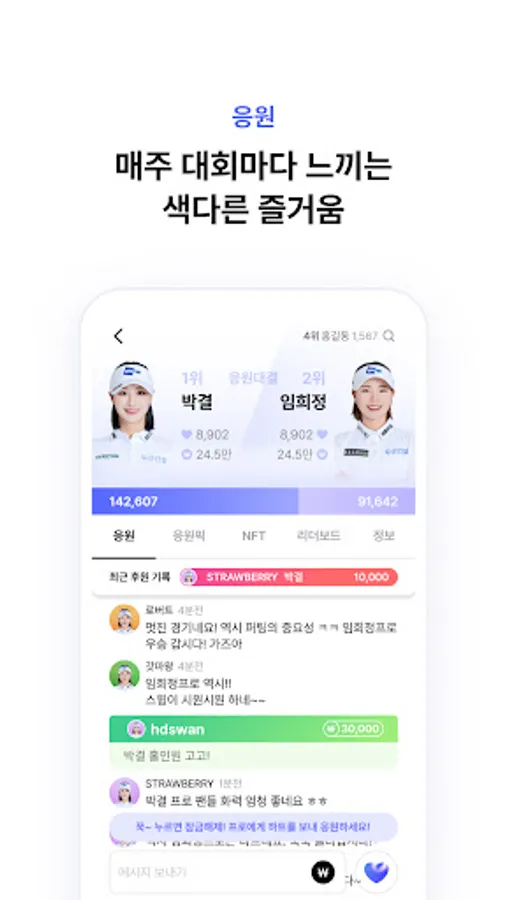 Participate in a cheering showdown during the tournament and cheer for your favorite pro. You can send sponsorship messages and hearts to pros, and the benefits vary depending on the NFT you have and the actual pro's performance.