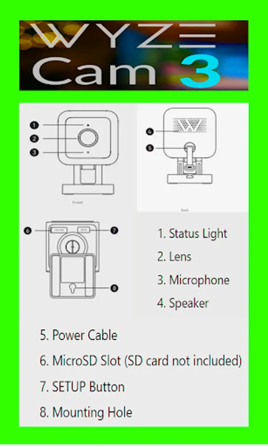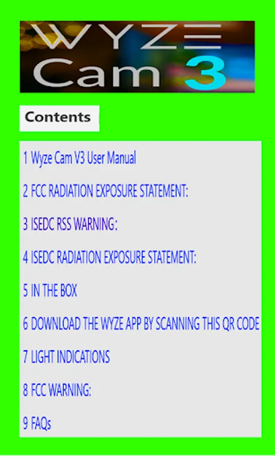 This app contains information about: Wyze Cam V3 User Manual, radiation connection statement, RSS ISEDC alert, in-box information, how to download WYZE app by scanning QR code and also light indication.