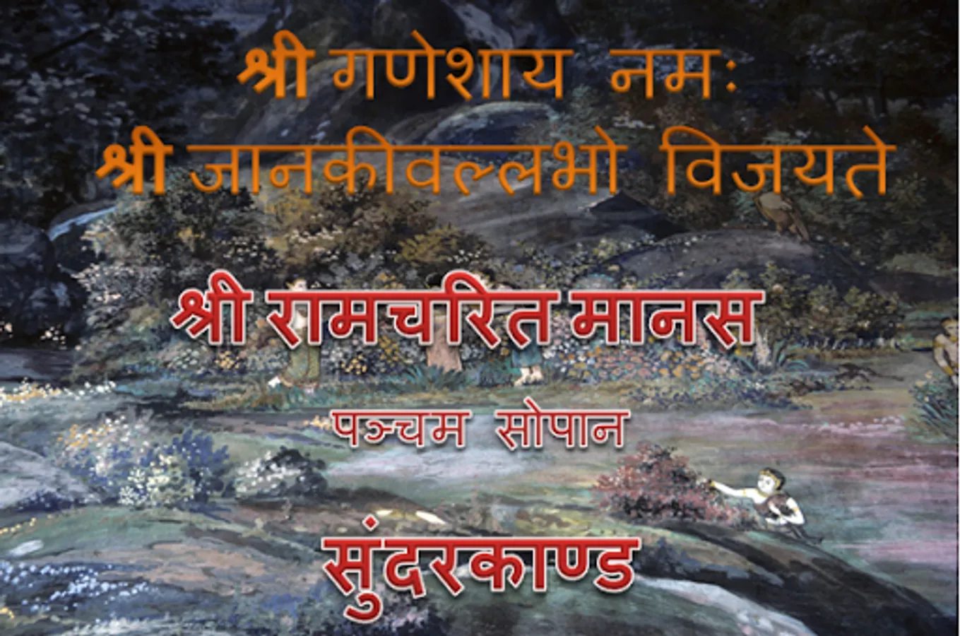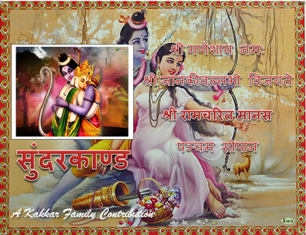 Sunder Kand (सुंदरकाण्ड), literally "beautiful episode/book", is the fifth book in the Hindu epic the Ramayana. It depicts the adventures of Hanuman. The original “Sunder Kand” is in “Sanskrit” and was composed by Valmiki, who was the first to scripturally record the Ramayana. “Sunder” Kanda is the only chapter of the Ramayana in which the hero is not Rama, but rather Hanuman. Hanuman's selflessness, strength, and devotion to Rama are emphasized in the text. Hanuman was fondly called Sunder by his mother “Anjani” and Sage Valmiki chose this name over others as this “kand” deals mainly with Hanuman's journey to Lanka.
