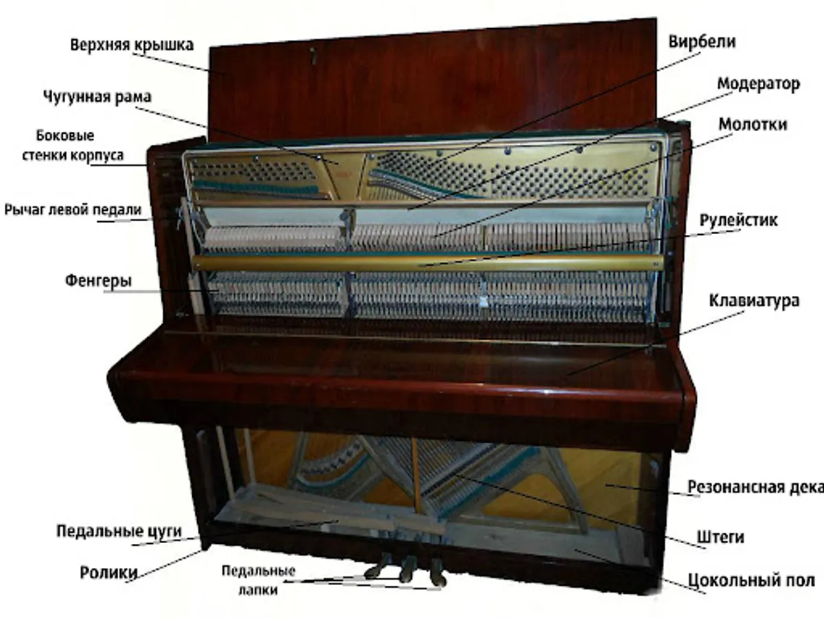 Резонансная дека, струнная одежда клавишного механизма, опорных конструкций (футор, металлическая рама, вирбельбанк). Сложная система рычагов механизма позволяет передать усилие от играющего через клавишу к молоточку, удар которого по струне производит звук.