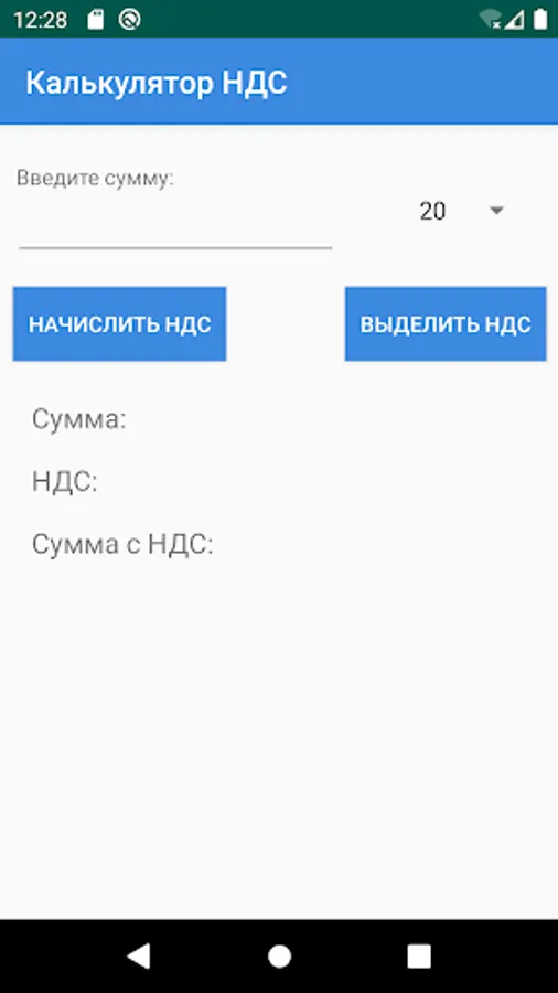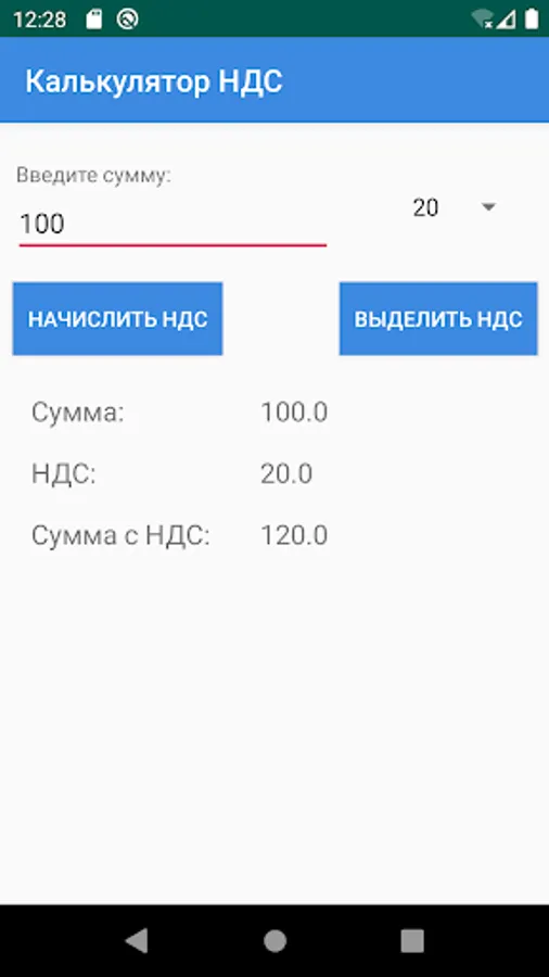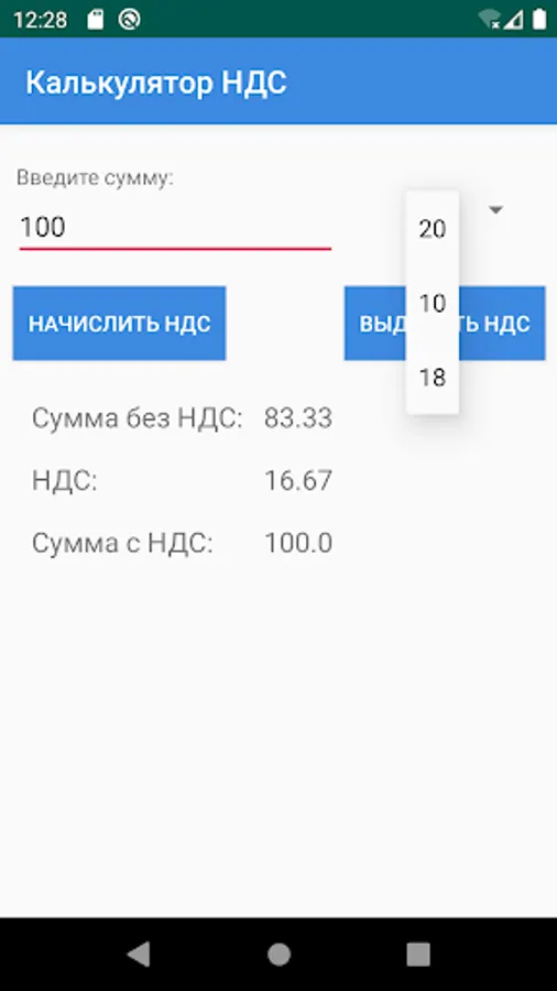 The application "VAT calculation | VAT calculator" allows you to allocate VAT and calculate VAT on the amount you entered. The application also allows you to choose three options for the percentage of VAT: VAT 10%, VAT 18%, VAT 20%.