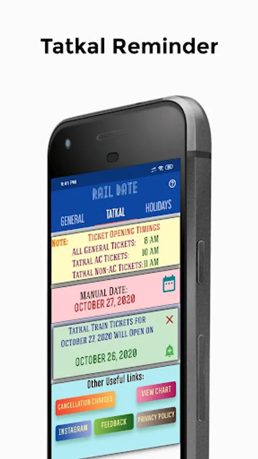 RAIL DATE App Calculates and gives date ,When the train tickets will open for your prescribed date. It also Includes features like ADD the Date to your calendar so that it will remind you to book tickets.