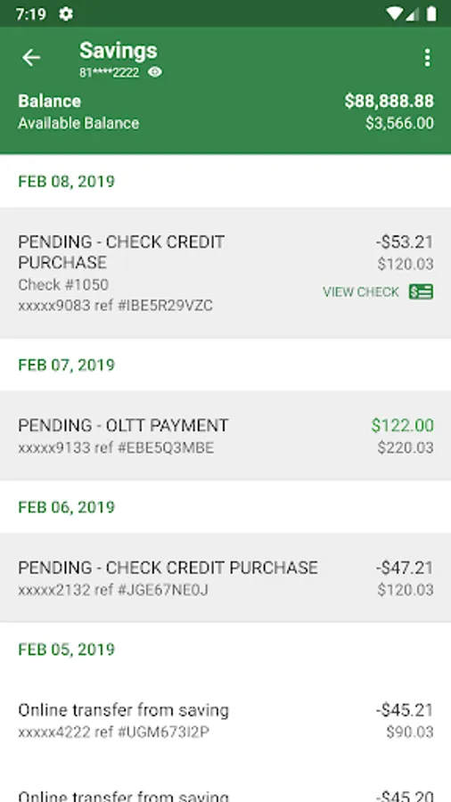 •Check your latest account balance and search recent transactions by date, amount, or check number.