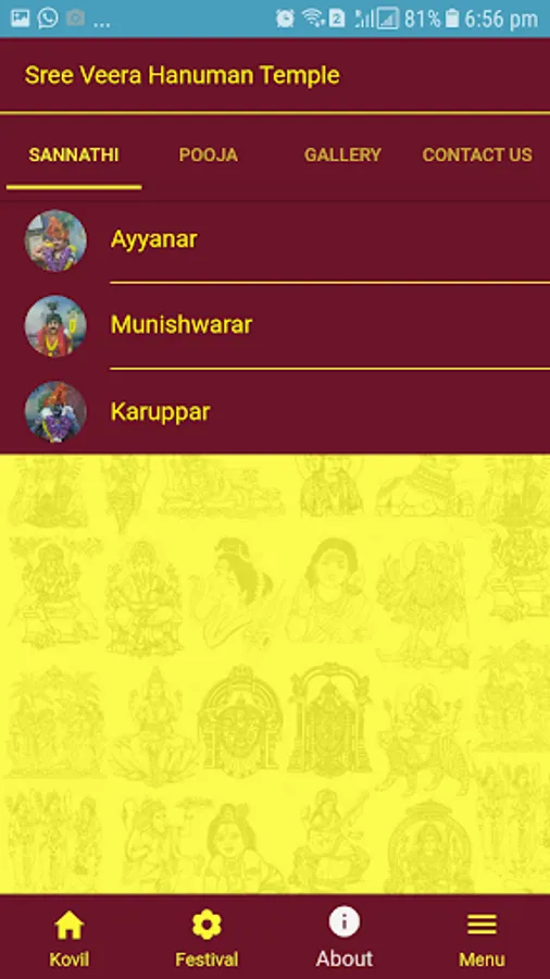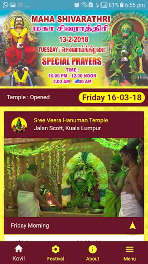Thiru Kovil app will provides real time information from temples every day open time, closing time, pooja time, festival news, festival banners ,Ubayathar information, pooja news, live streaming alert,Uabyathar alert, gallery and contact information to devotee.