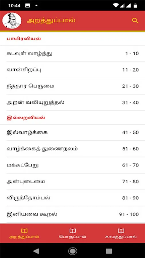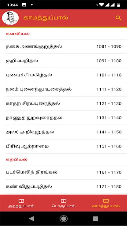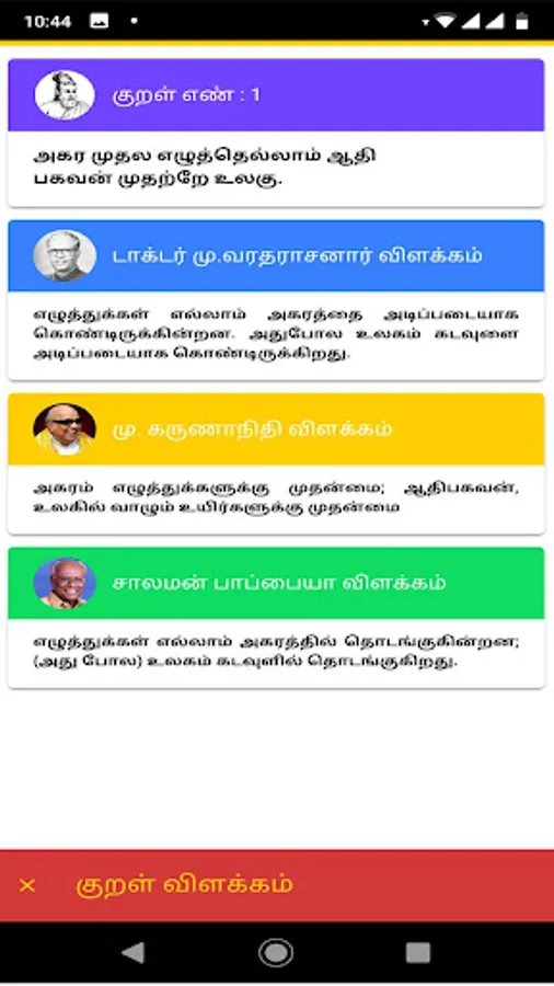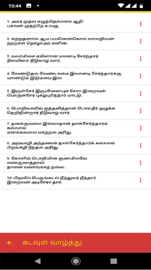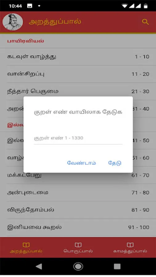 The Tirukkural, or shortly the Kural, is a classic Tamil text consisting of 1,330 couplets or Kurals, dealing with the everyday virtues of an individual. It is one of the two oldest works now extant in Tamil literature in their entirety, the other being the Tolkappiyam