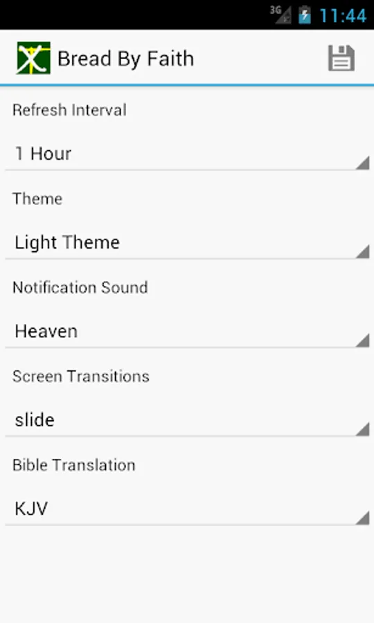 Notification sound may be changed and dark or light themes are available. Notification can be set to silent. Highlight a section and share it or share the whole devotion.
