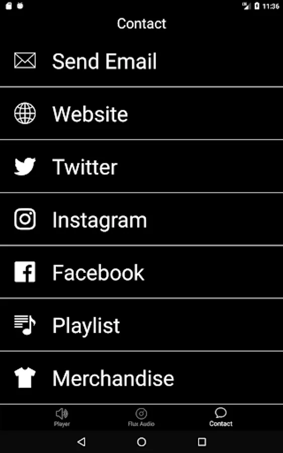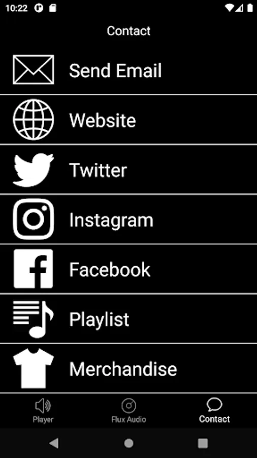 • A CONTACT page to interact with Kizrock via social networks, write to it, access the website, consult the playlists...