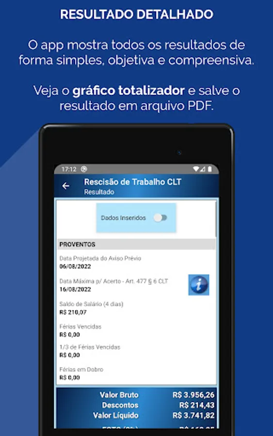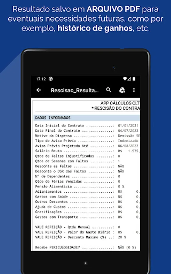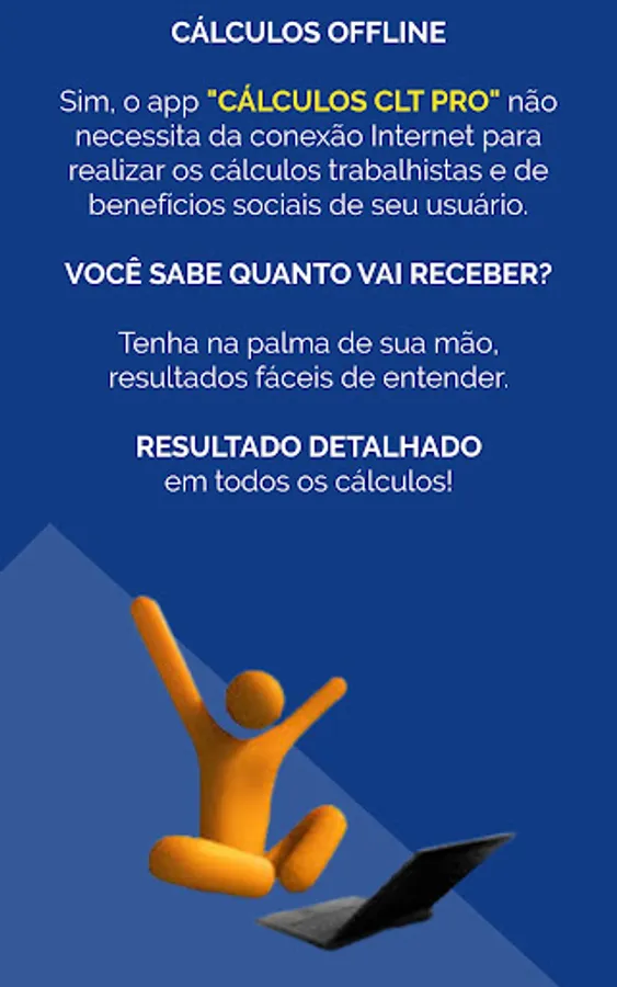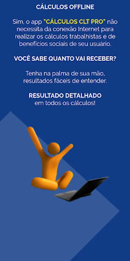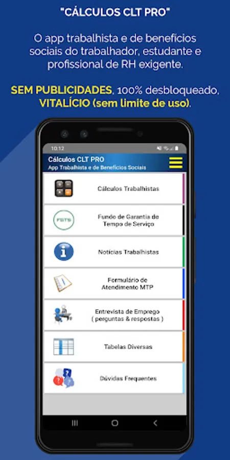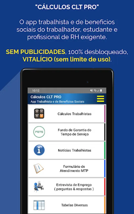 "Cálculos CLT PRO" is an application that calculates labor CLT (Consolidation of Labor Laws) and social benefits (unemployment insurance, FGTS), provides various queries, shows tables with percentages of deductions and gains, benefit payment date social FGTS Birthday Withdrawal, frequent and specific questions about the CLT, teaches the user how to make labor calculations manually for a perfect understanding of how the calculations of funds are made by the application and much more.