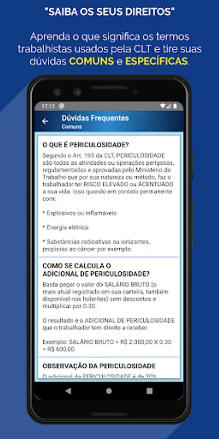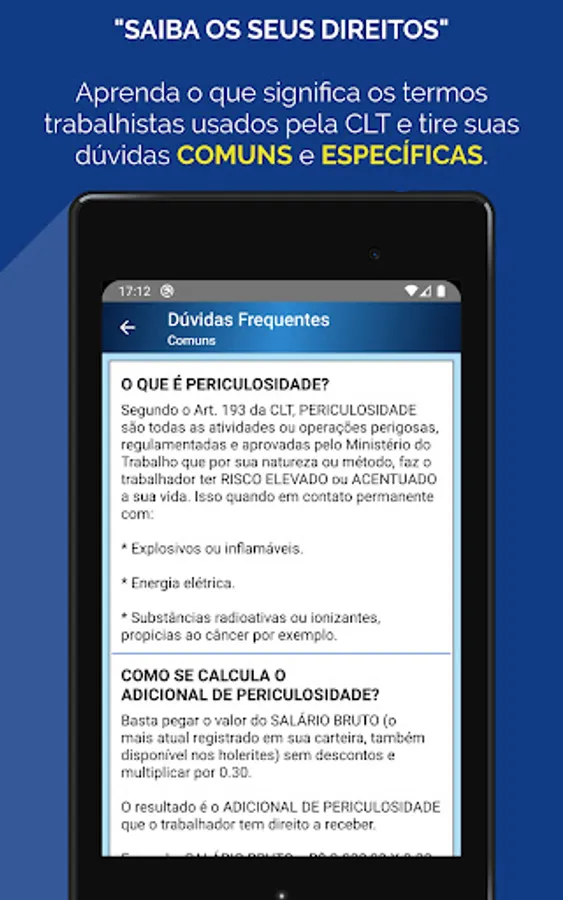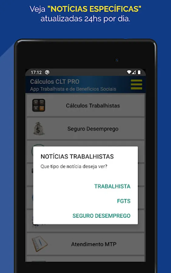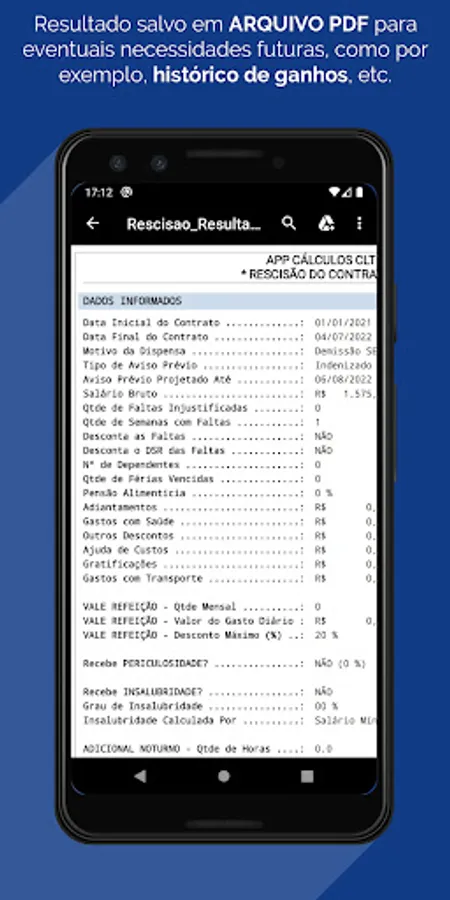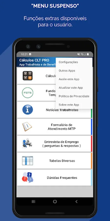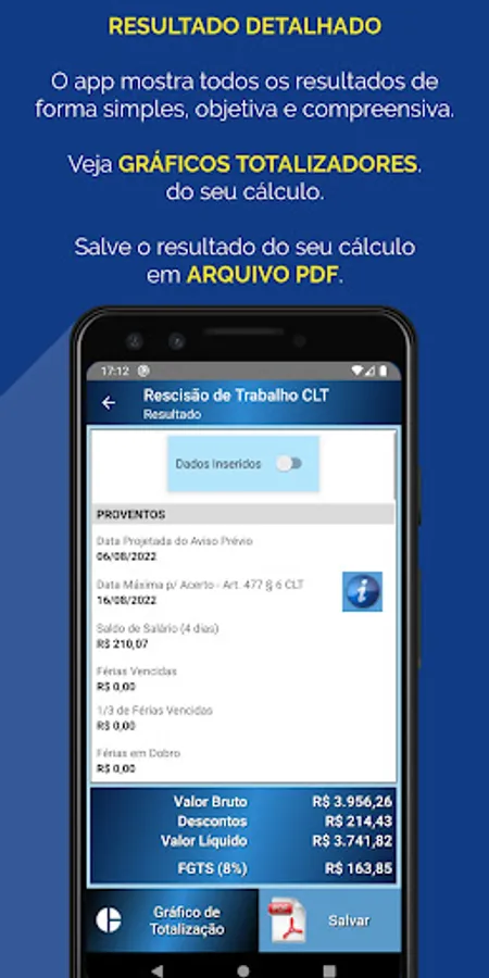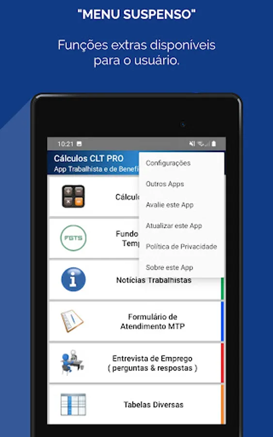 "Cálculos CLT PRO" is an application that calculates labor CLT (Consolidation of Labor Laws) and social benefits (unemployment insurance, FGTS), provides various queries, shows tables with percentages of deductions and gains, benefit payment date social FGTS Birthday Withdrawal, frequent and specific questions about the CLT, teaches the user how to make labor calculations manually for a perfect understanding of how the calculations of funds are made by the application and much more.