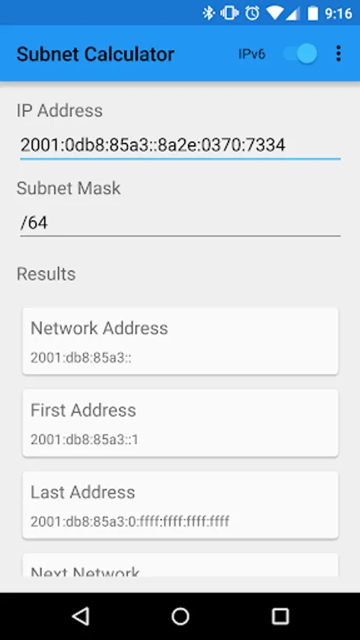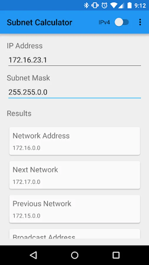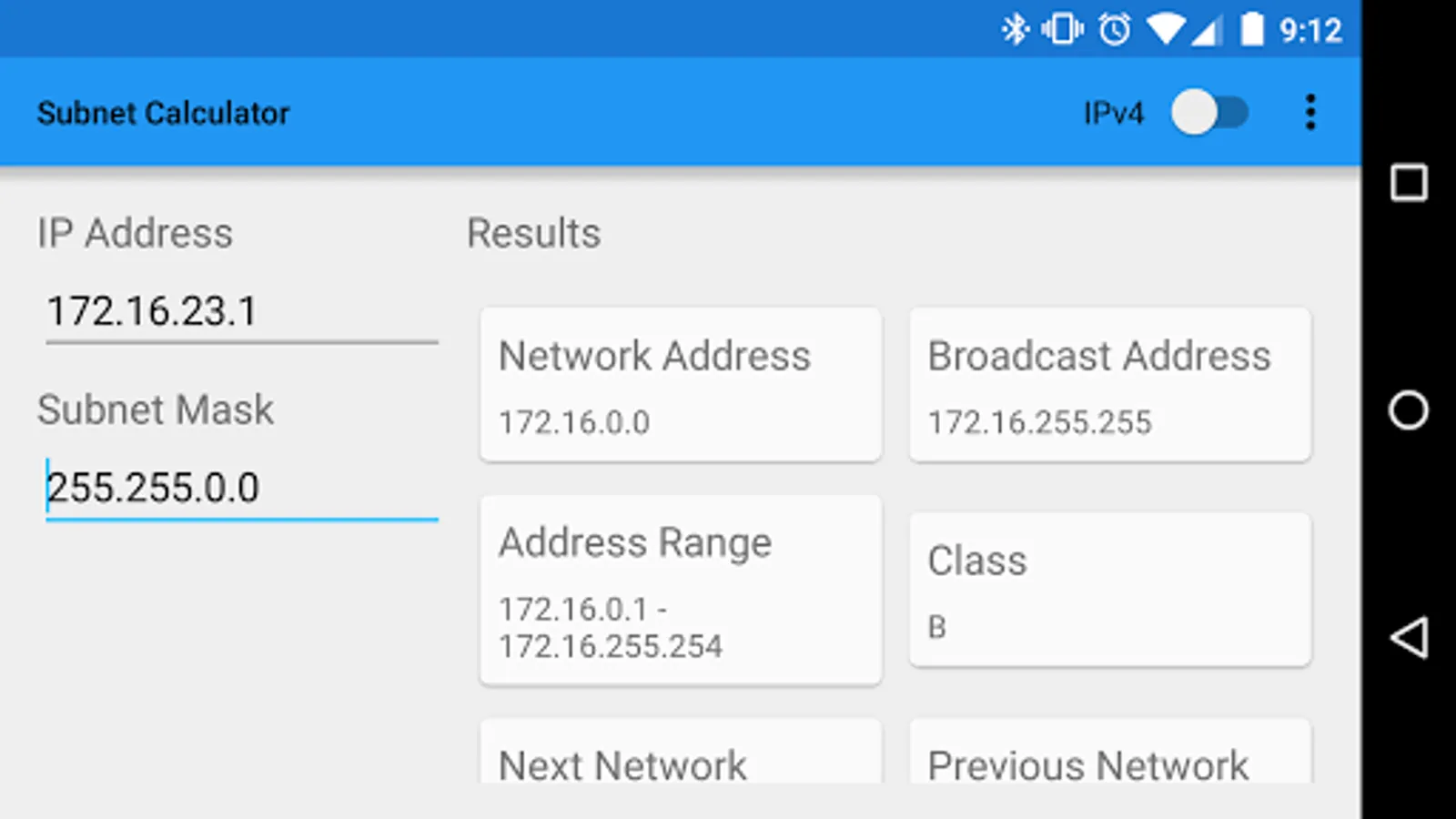 - Results for Network Address, Broadcast Address, First Address, Last Address, Next Network, Last Network
