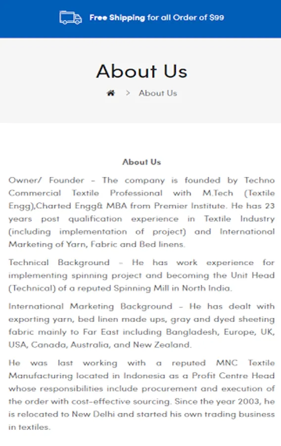 Owner/ Founder - The company is founded by Techno Commercial Textile Professional with M.Tech (Textile Engg),Charted Engg& MBA from Premier Institute. He has 23 years post qualification experience in Textile Industry (including implementation of project) and International Marketing of Yarn, Fabric and Bed linens.