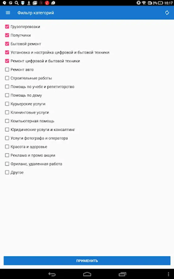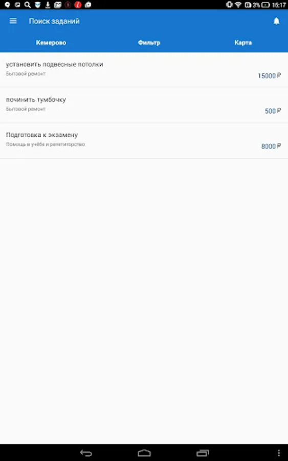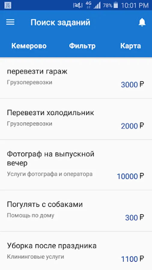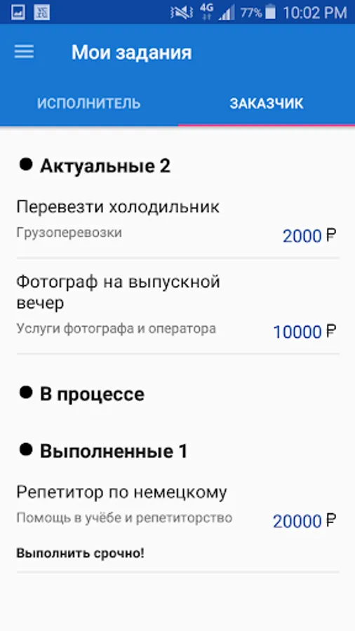 - Convenient and universal filling of placed tasks: selection of categories, selection of the currency of settlement with the contractor, indicating the address on the map, adding photos.