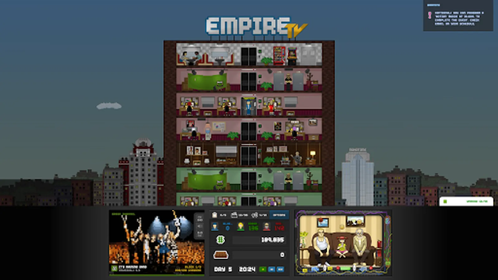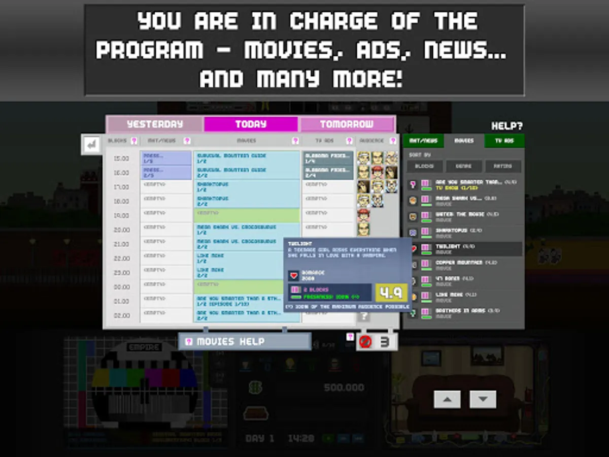 In Empire TV Tycoon you manage a television channel and take on the fight for audiences while leading your business to fame and fortune. You will choose the content of your channel, select advertisers, hire staff and actors, manage your own show productions, and much more! The game was inspired by games like Mad TV, Mud TV and other movie management games, with a modern approach on how to produce custom content like movies or TV shows. Yet you better not be tempted to use illegal content! Just like in real life, pirated movies may be cheaper, but the risk of using them is high and police forces are always on the alert.