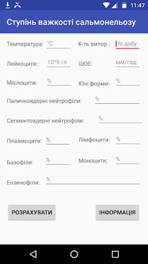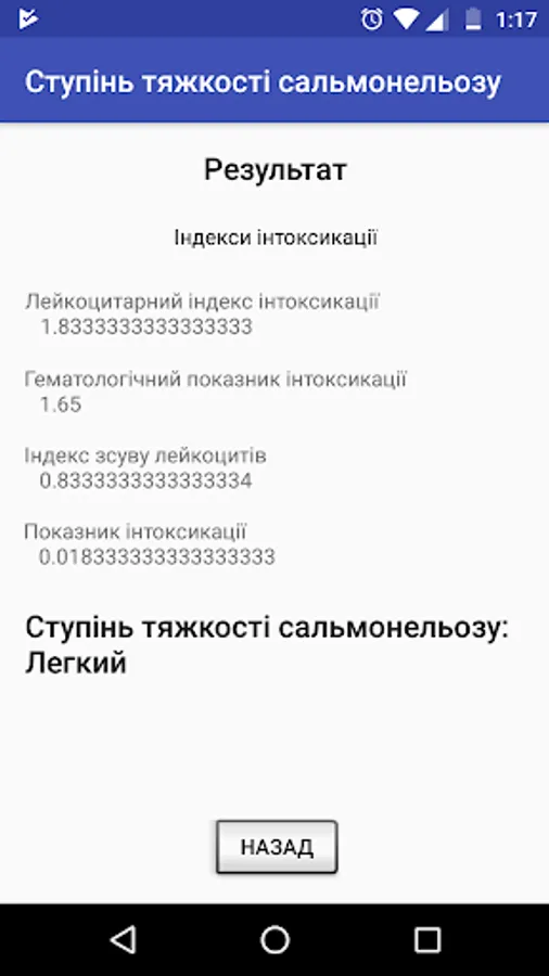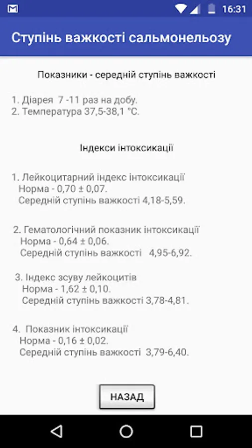 It is very important to carry out diagnosis of the disease. There is a formula by which you can get salmonellosis severity indicators. It is therefore important to have a mobile application that can automate this work.