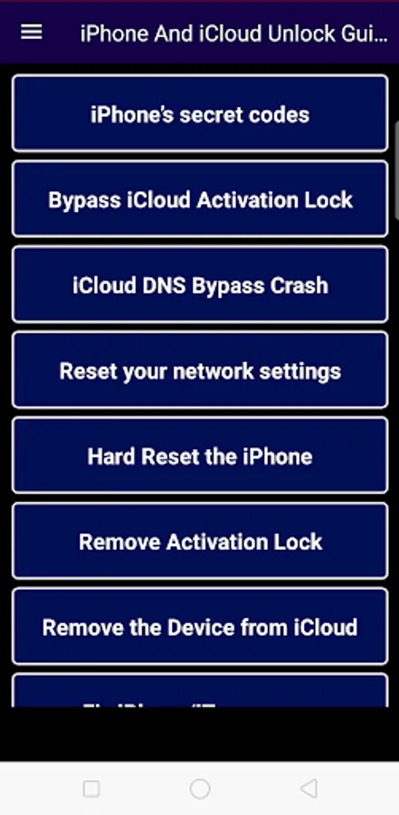 iPhone And iCloud Unlock Guide. This app has iPhone’s secret codes, Bypass iCloud Activation Lock, iCloud DNS Bypass Crash, Reset your network settings, Hard Reset the iPhone, Remove Activation Lock, Remove the Device from iCloud, Fix iPhone/iTunes error, Completely Reset an iPhone, Recovery Mode on iPhone, and much more. I think this app you need. We hope you find the app Useful. If You Like this App, Give it Five Stars.